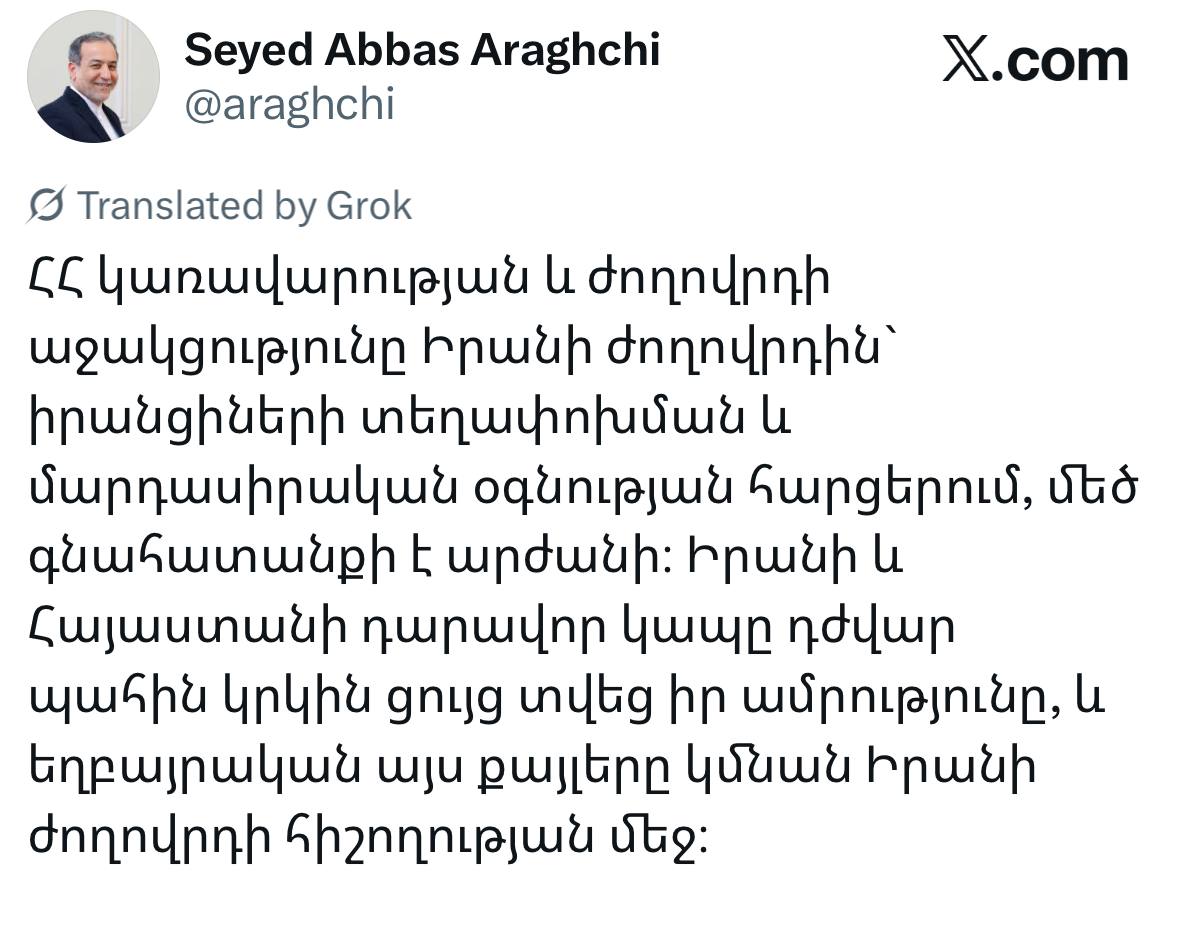وزير الخارجية السيد عباس عراقجي يشكر حكومة وشعب أرمينيا