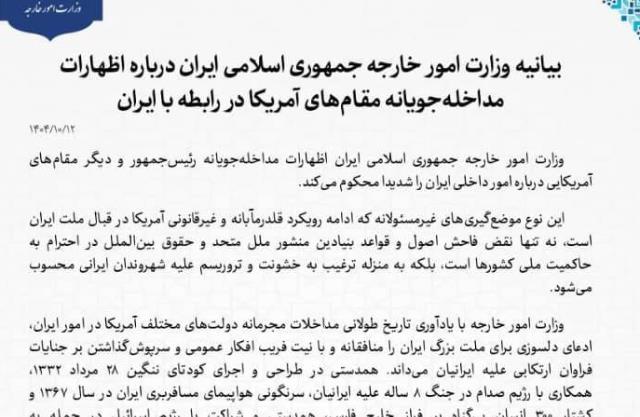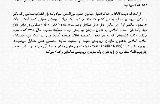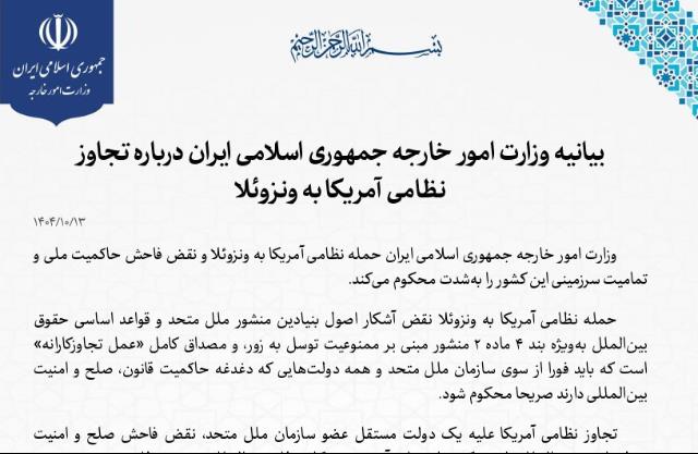 وأصدرت وزارة خارجیة الجمهوریة الإسلامیة الإیرانیة بیاناً أدانت فیه بشدة الاعلان عن إقامة علاقات دبلوماسیة بین البحرین والکیان الصهیونی، واعتبرته خطوة مخزیة ومذلة من قبل البحرین لذبح تطلعات فلسطین وعدة عقود من النضال وتحمل الشعب الفلسطینی المعاناة والآلام فی مذبحة الانتخابات الأمریکیة.