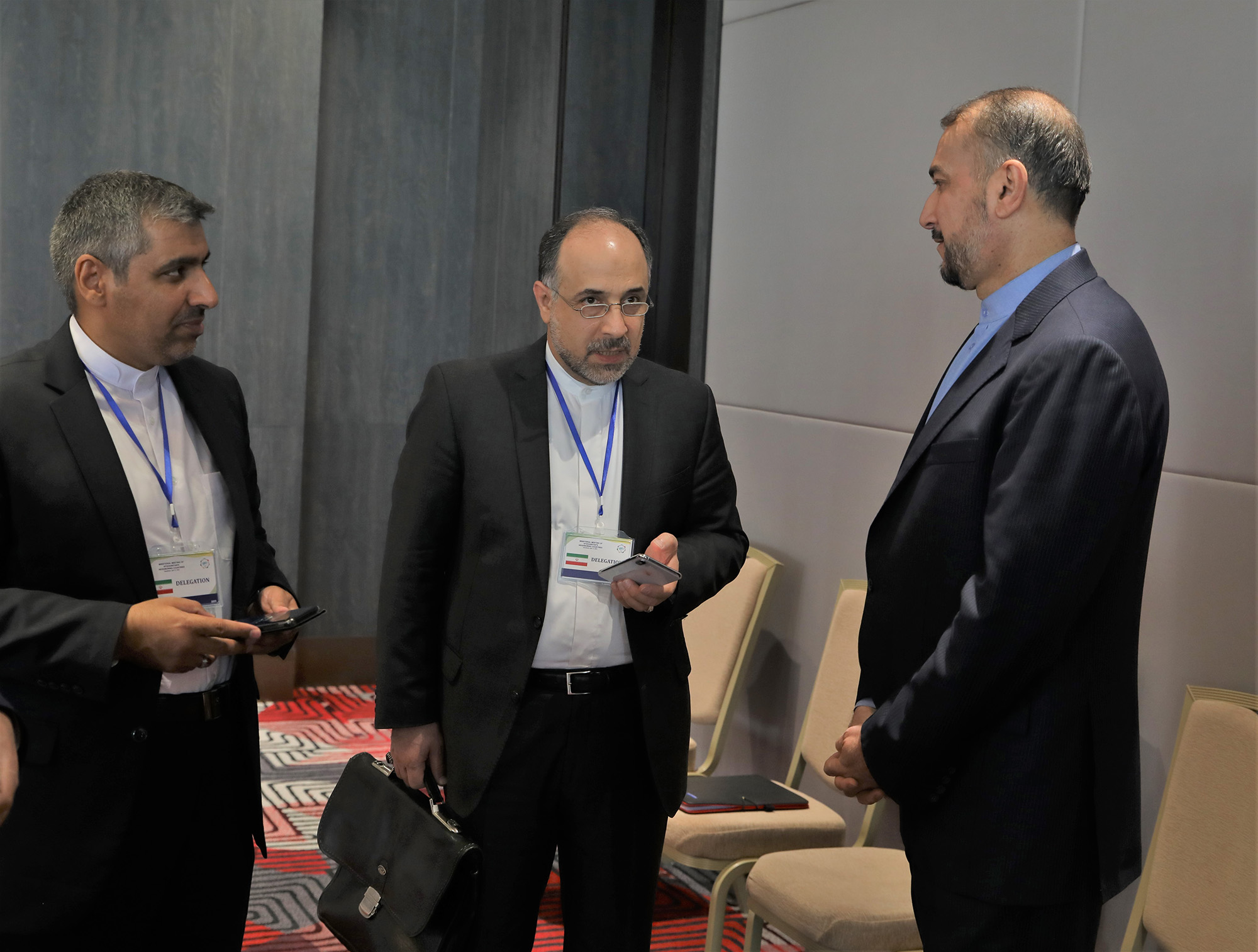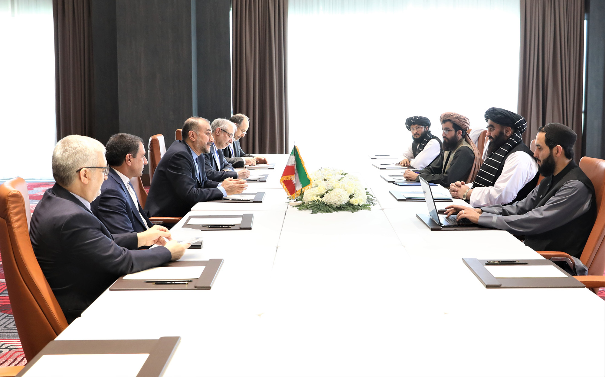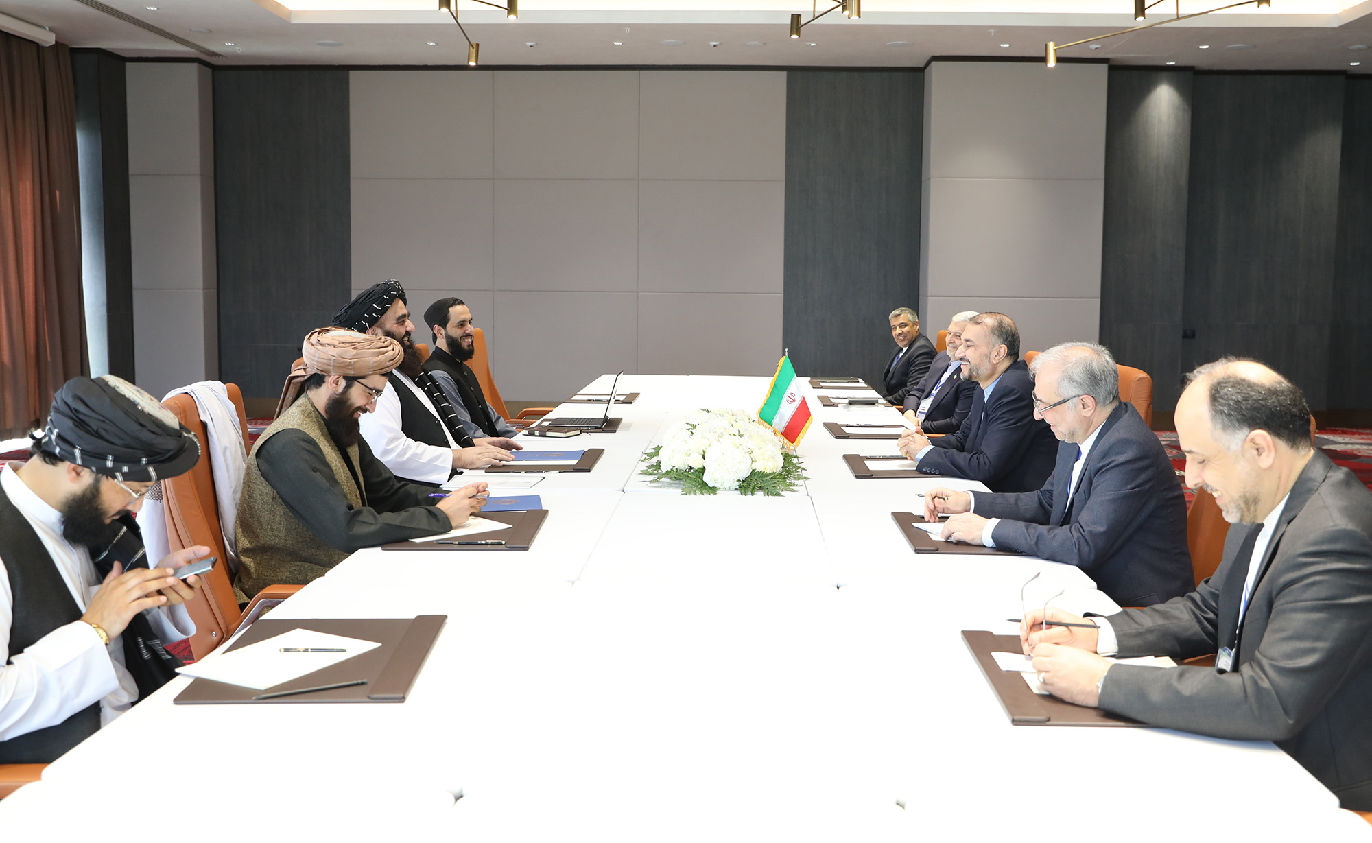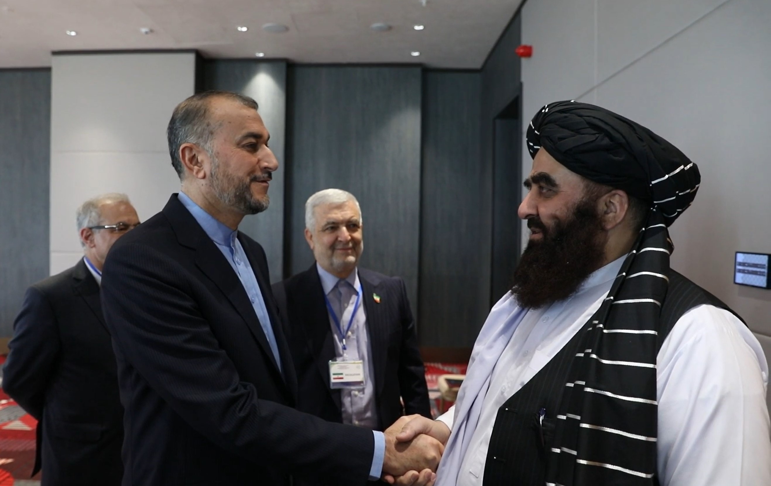 التقى وزیر الخارجیة الدکتور حسین أمیرعبداللهیان، على هامش اجتماع دول جوار أفغانستان، المشرف على الخارجیة فی الحکومة الأفغانیة المؤقتة أمیر خان متقی