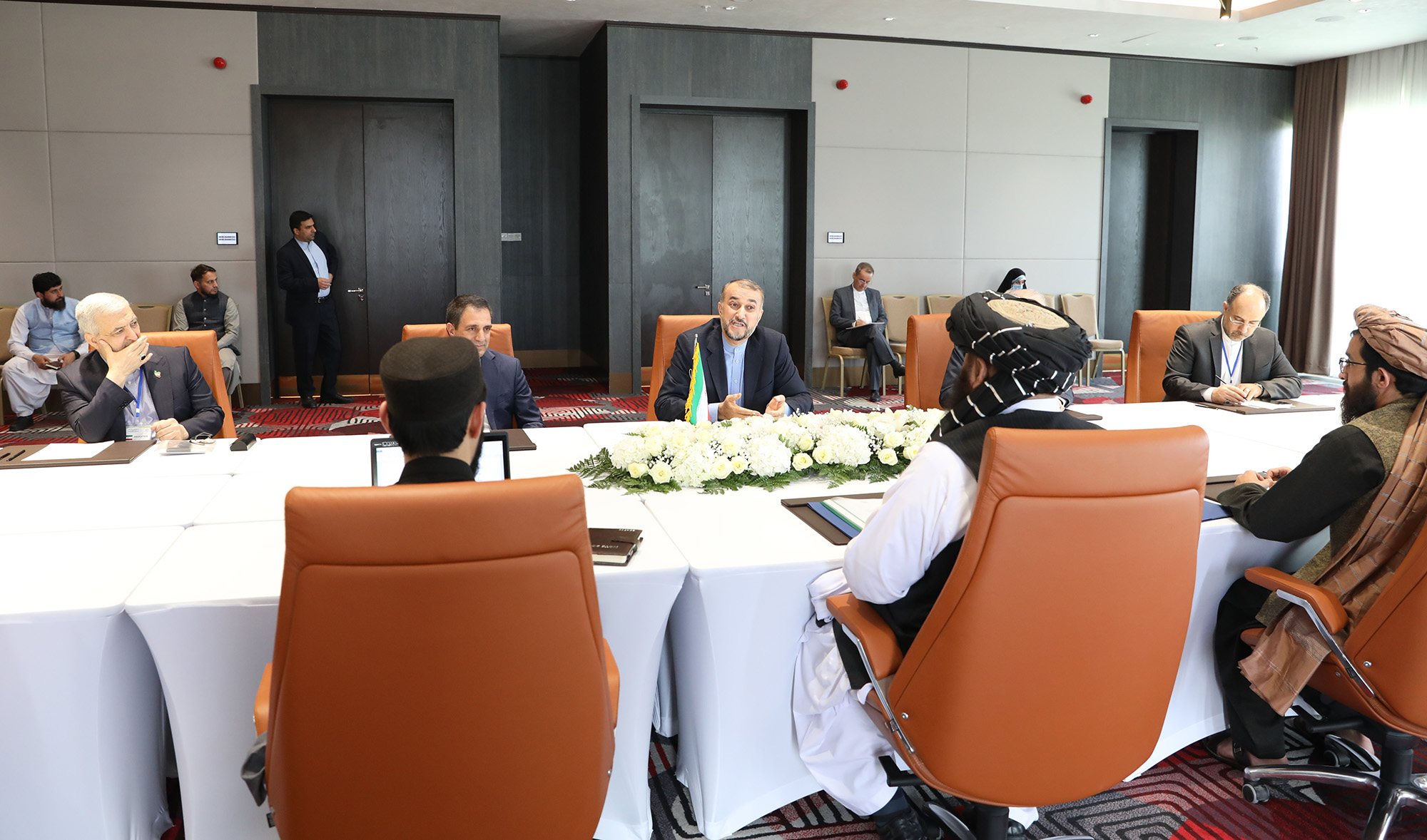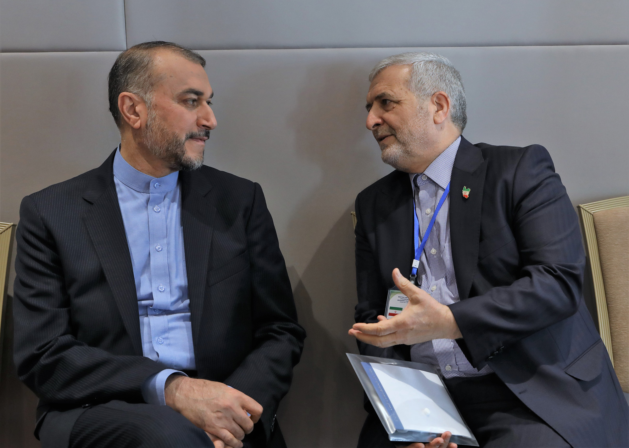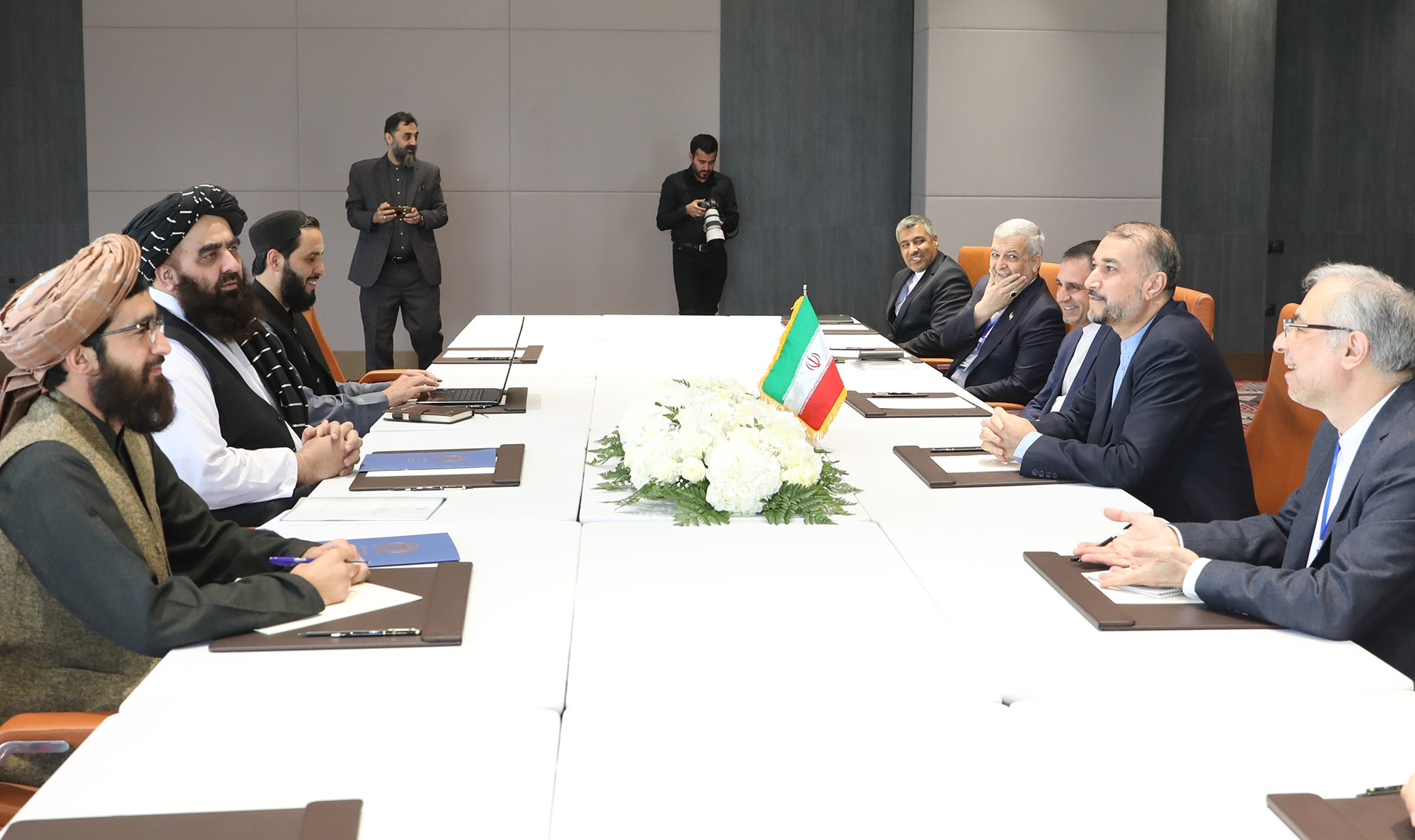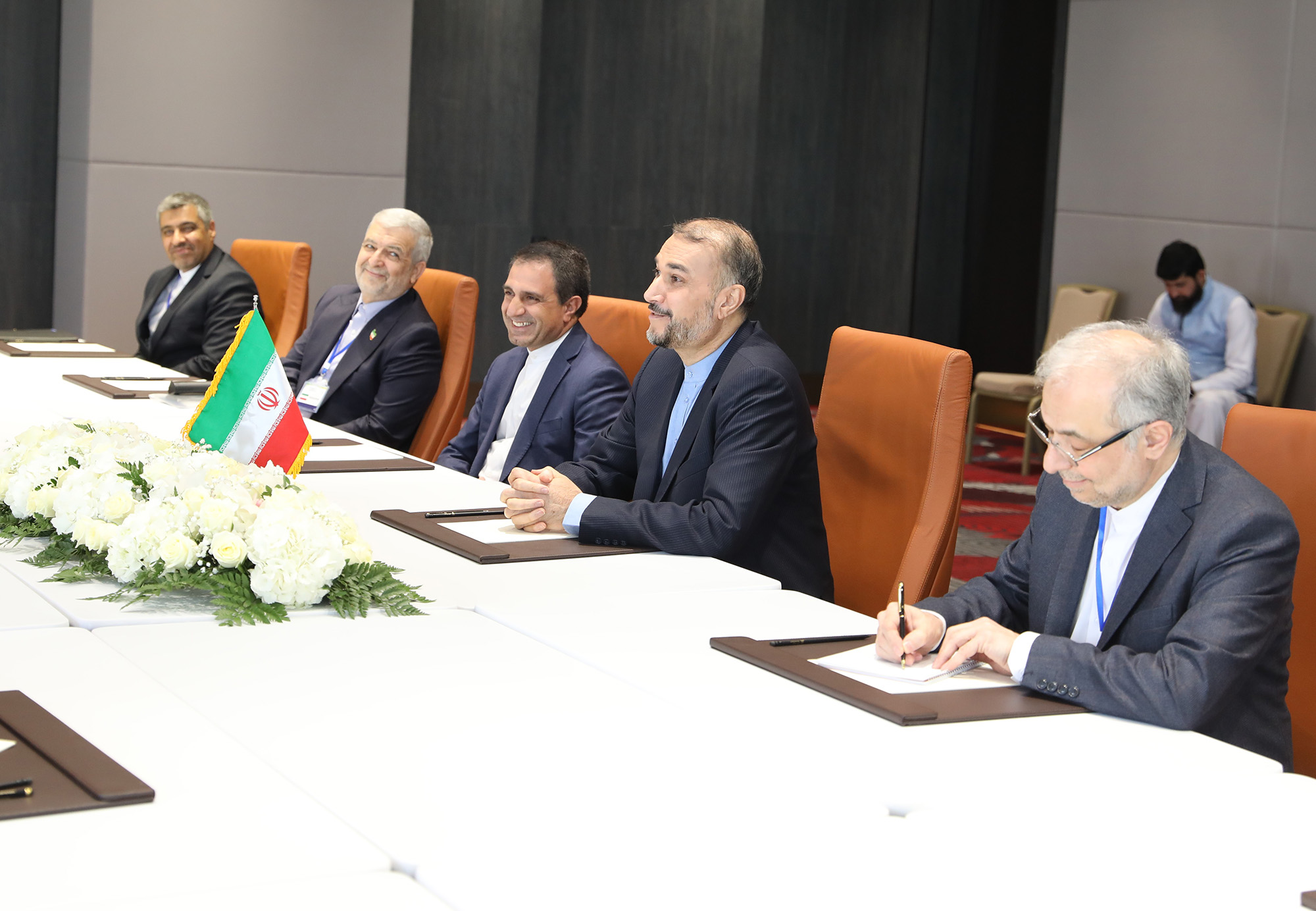 التقى وزیر الخارجیة الدکتور حسین أمیرعبداللهیان، على هامش اجتماع دول جوار أفغانستان، المشرف على الخارجیة فی الحکومة الأفغانیة المؤقتة أمیر خان متقی