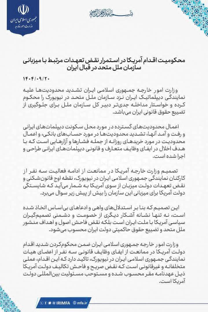 وتُدين وزارة خارجية الجمهورية الإسلامية الإيرانية بشدةٍ تصرف الحكومة الأمريكية بمنع ثلاثة أعضاء من وفد الجمهورية الإسلامية الإيرانية في نيويورك من أداء واجباتهم القانونية، مؤكدةً أن هذا التصرف عملٌ خاطئٌ وغير قانوني، ويمثل انتهاكاً صارخاً لالتزامات الحكومة الأمريكية بموجب اتفاقية المقر الرئيسي، ويستحق من الحكومة الأمريكية المسؤولية الدولية.