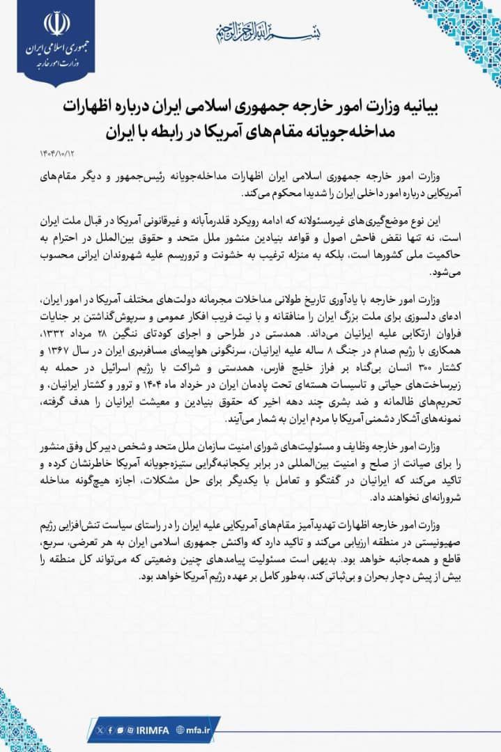 إن هذه المواقف غير المسؤولة، التي تعد استمرارًا لنهج أمريكا الاستبدادي وغير القانوني تجاه الشعب الإيراني، لا يُمثل انتهاكًا صارخًا للمبادئ والقواعد الأساسية لميثاق الأمم المتحدة والقانون الدولي بشأن احترام السيادة الوطنية للدول فحسب، بل يُشكل أيضًا تحريضًا على العنف والإرهاب ضد المواطنين الإيرانيين.