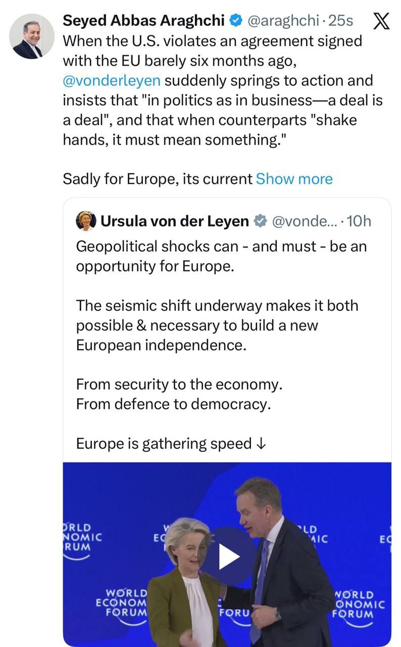 نشر عباس عراقجي وزير الخارجية الايراني رسالة على حسابه الرسمي بمنصة إكس وفيما يلي نص الرسالة: