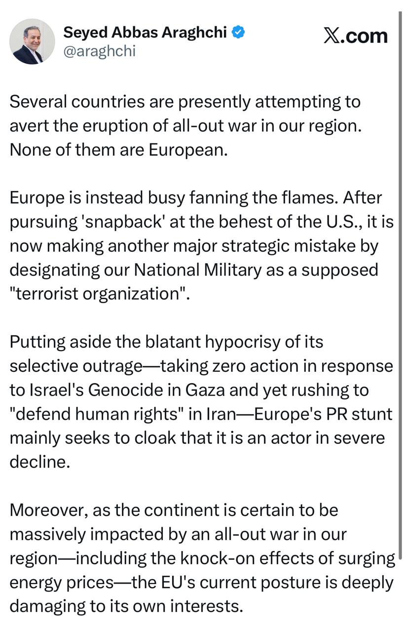 منشور وزير الخارجية، على منصة إكس تعليقا على الإجراءات العدائية االأوروبية ضد إيران: أوروبا منشغلة في تأجيج نيران الأزمة