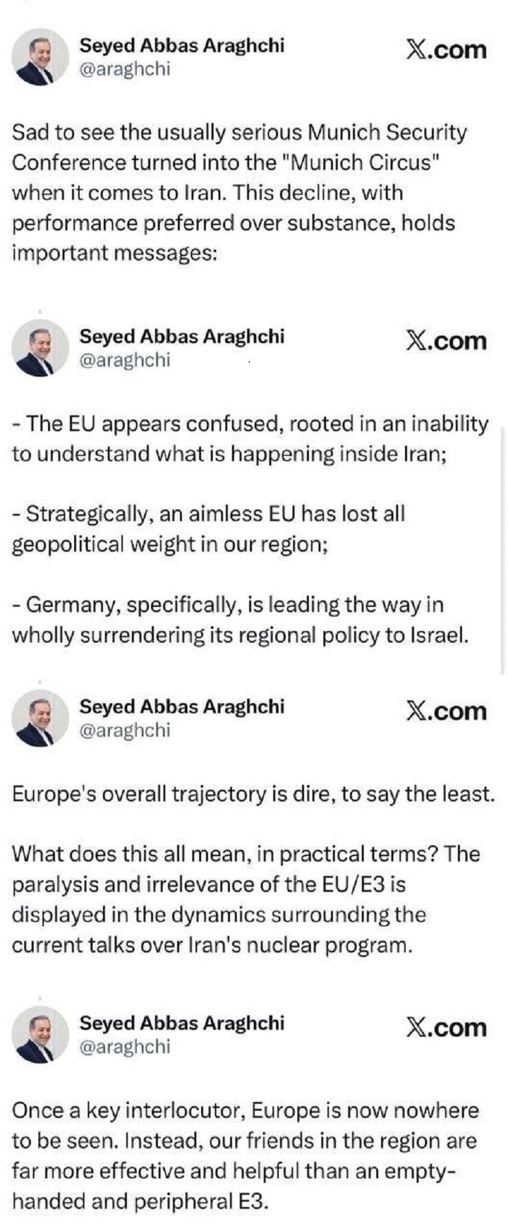 أوروبا، التي كانت ذات يوم لاعباً رئيسياً في المحادثات، باتت غائبة تماماً عن المشهد. في المقابل، يتصرف أصدقاؤنا في المنطقة بفعالية وفائدة أكبر بكثير من هذه الترويكا الأوروبية العاجزة والمهمشة.