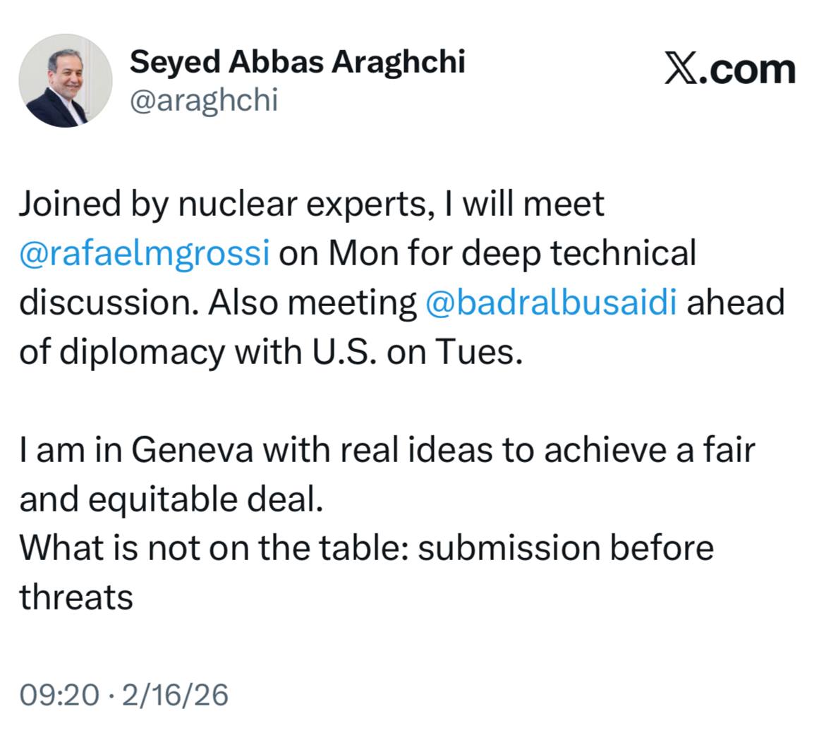 سألتقي، اليوم برفقة خبرائنا النوويين، رافائيل غروسي (المدير العام للوكالة الدولية للطاقة الذرية) لإجراء مباحثات فنية دقيقة. كما سألتقي بدر البوسعيدي (وزير خارجية سلطنة عمان) قبل بدء المشاورات الدبلوماسية مع الولايات المتحدة يوم الثلاثاء.