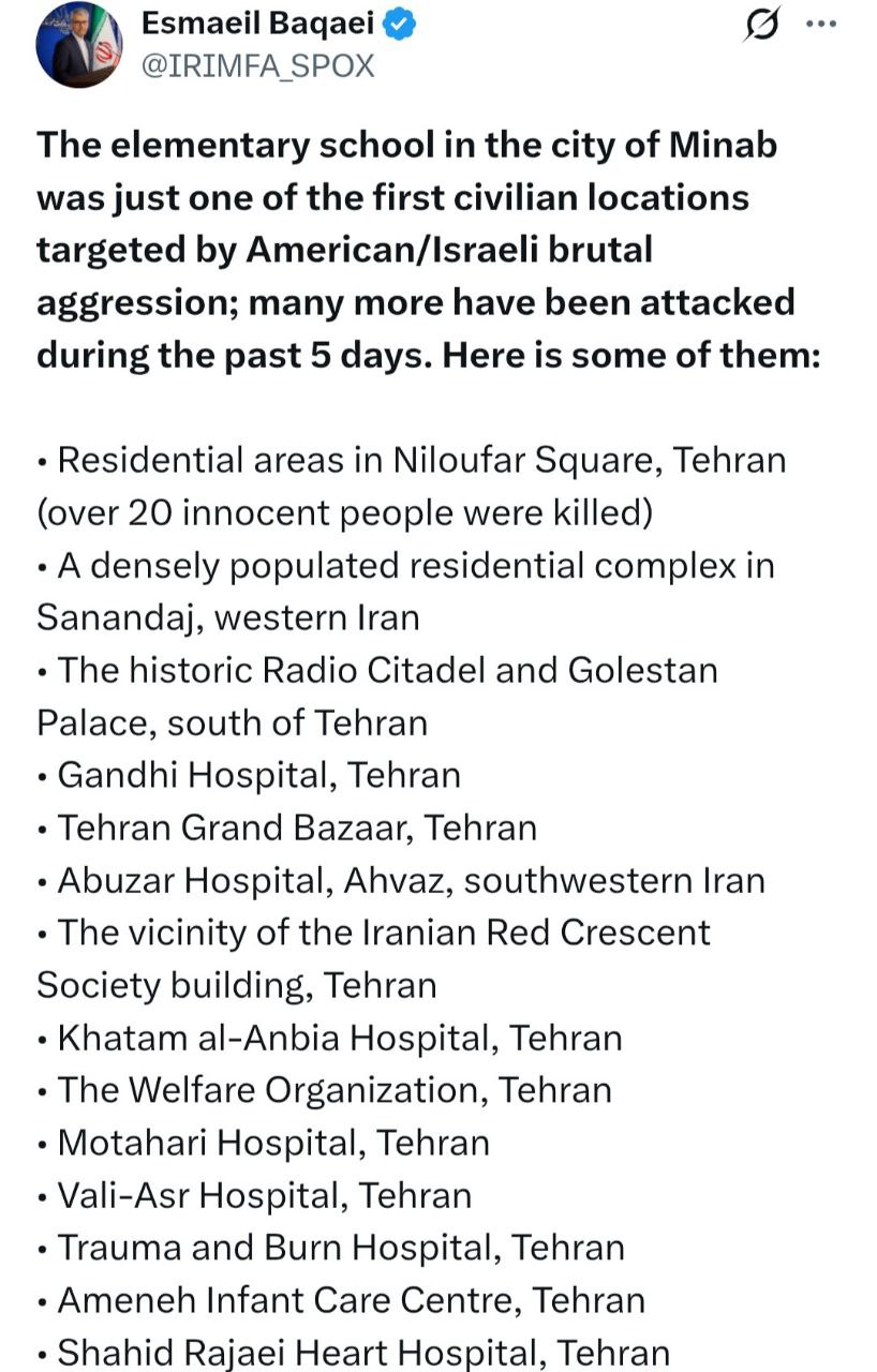 نشر المتحدث باسم وزارة الخارجية إسماعيل بقائي، في رسالة عبر منصة إكس، قائمة ببعضٍ من عشرات المراكز المدنية طالتها الهجمات الأمريكية والإسرائيلية، بما في ذلك مناطق سكنية ومستشفيات ومدارس ومراكز إغاثة ومواقع تاريخية — من مدرسة شجرة طيبة الابتدائية في مدينة ميناب إلى مقرين للشرطة الدبلوماسية في طهران. وكتب:
