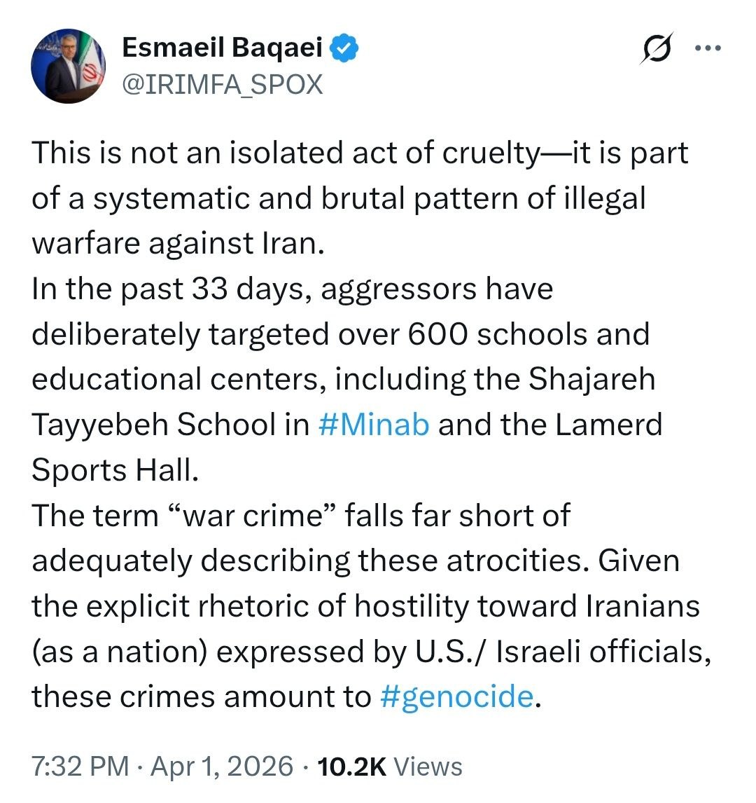 كتب المتحدث باسم وزارة الخارجية إسماعيل بقائي، عبر منصة "إكس"، رداً على تقارير وسائل الإعلام الأمريكية حول استخدام أمريكا لصاروخ جدید في الهجوم على ملعب "لامرد" (بمحافظة فارس) ومقتل 21 رياضياً ناشئاً، ما يلي: